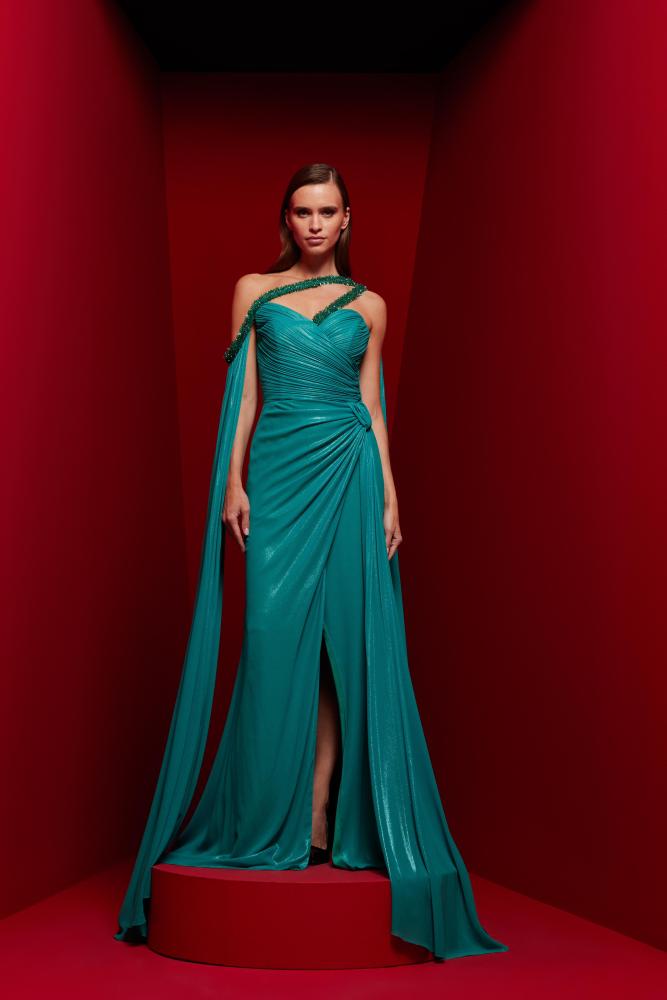 - التصميم: كتف واحدة مع تطريزات براقة وذيل طويل.