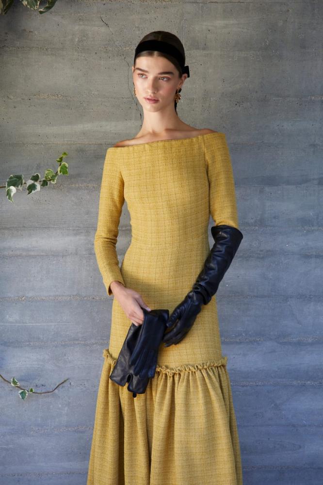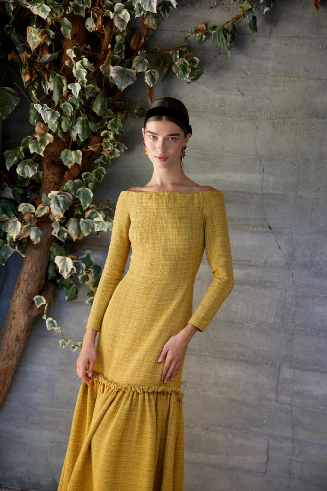 فستان شتوي أصفر ماكسي بأكتاف مكشوفة