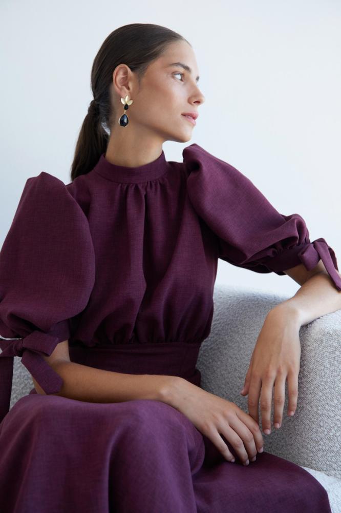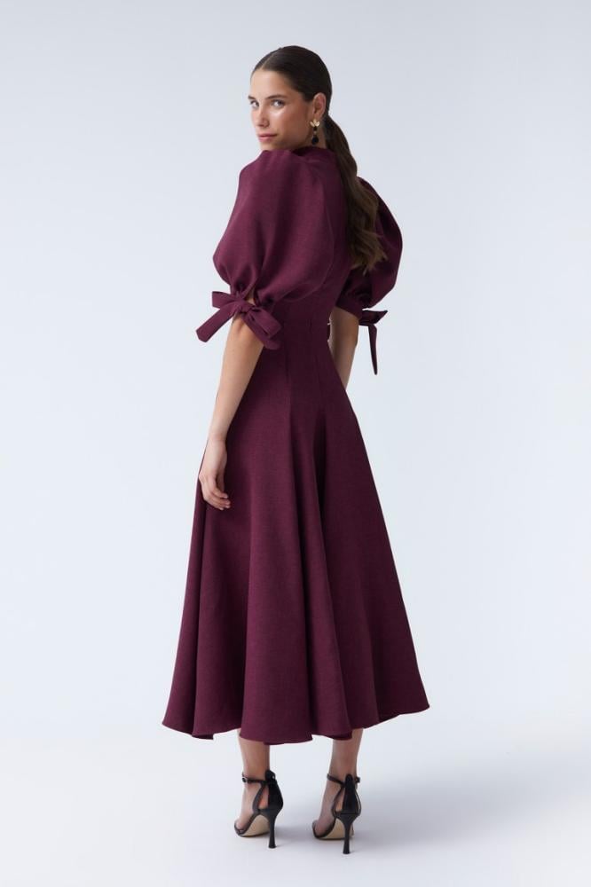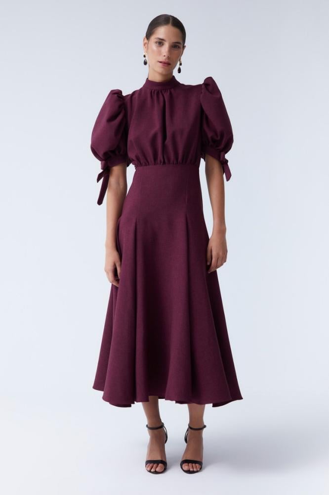 فستان عنابي برقبة ضيقة وأكمام منفوخة