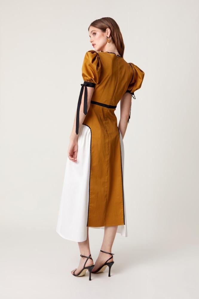 أبرزي أناقتك الراقية مع هذا الفستان الميدي المميز بلونه الأصفر الذهبي والأبيض. يتميز الفستان بتصميمه العصري والأنيق مع أكمام منفوخة تضفي لمسة من الفخامة والتميز. تم إبراز تفاصيل الخصر بشكل دقيق ليبرز جمال القوام. القماش الناعم والتفاصيل الدقيقة على الأكمام والأطراف يجعل هذا الفستان خيارًا مثاليًا للمناسبات.
