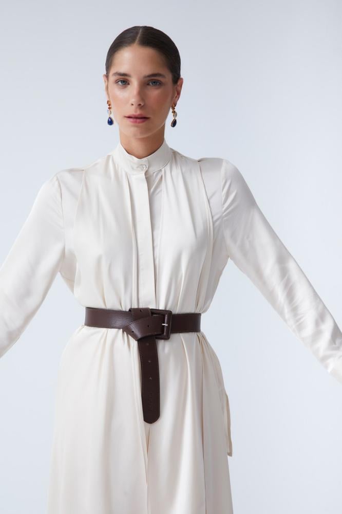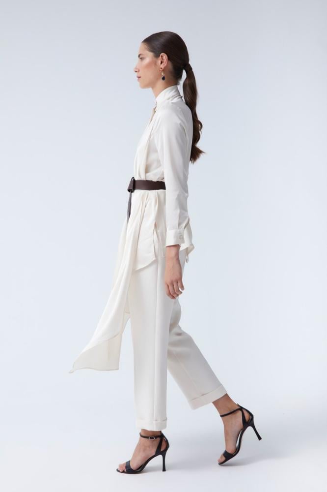 قميص أبيض يتميز بقصة طويلة من الأمام
